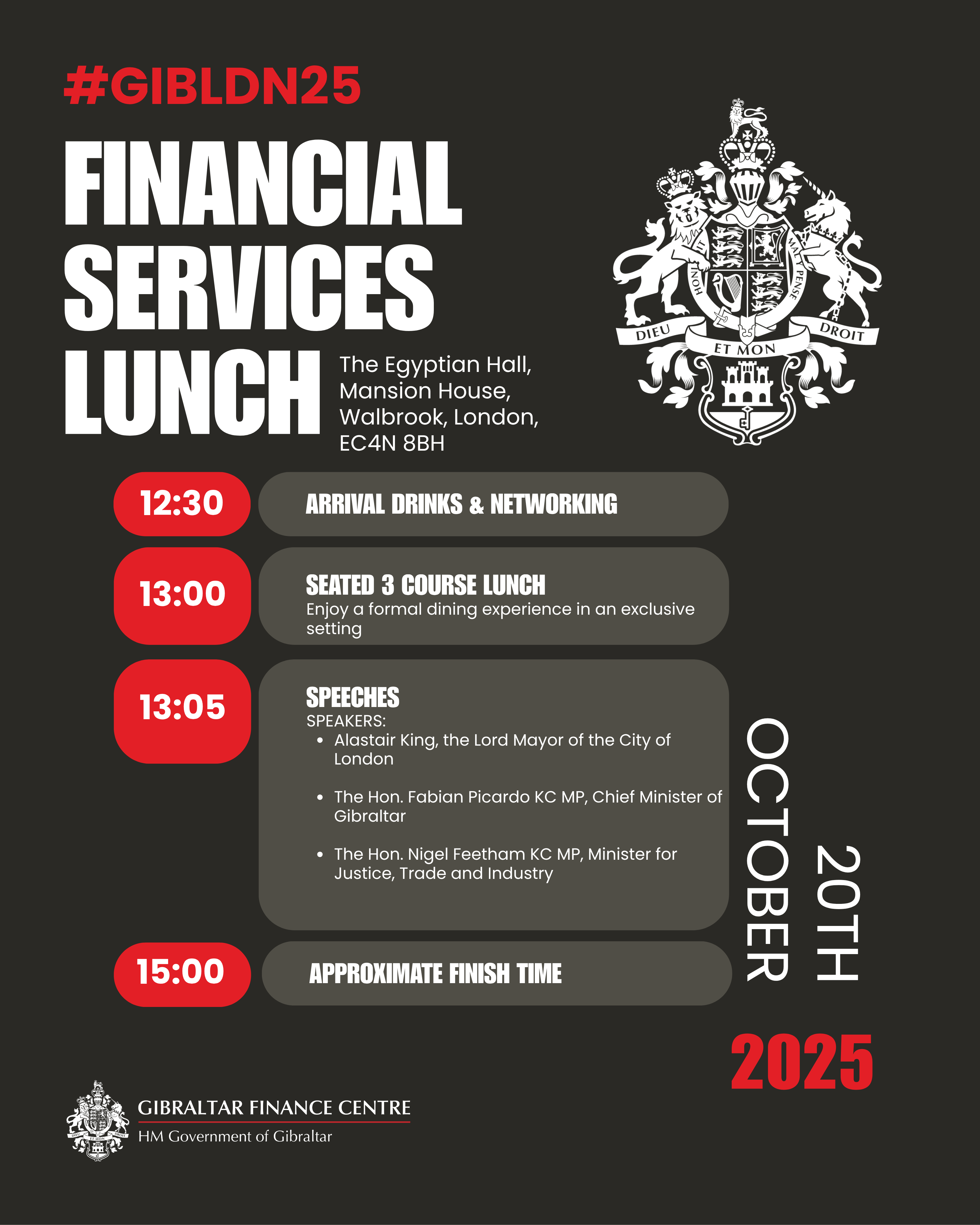 Nigel Feetham, Minister for Justice, Trade, and Industry, has issued notifications to the Gibraltar Finance Centre Council regarding a series of financial services events scheduled to take place in London this October at the Egyptian Hall, Mansion House, Walbrook, London EC4N 8BH Hosted by the Chief Minister The Hon Fabian Picardo KC MP and The Hon Nigel Feetham KC MP