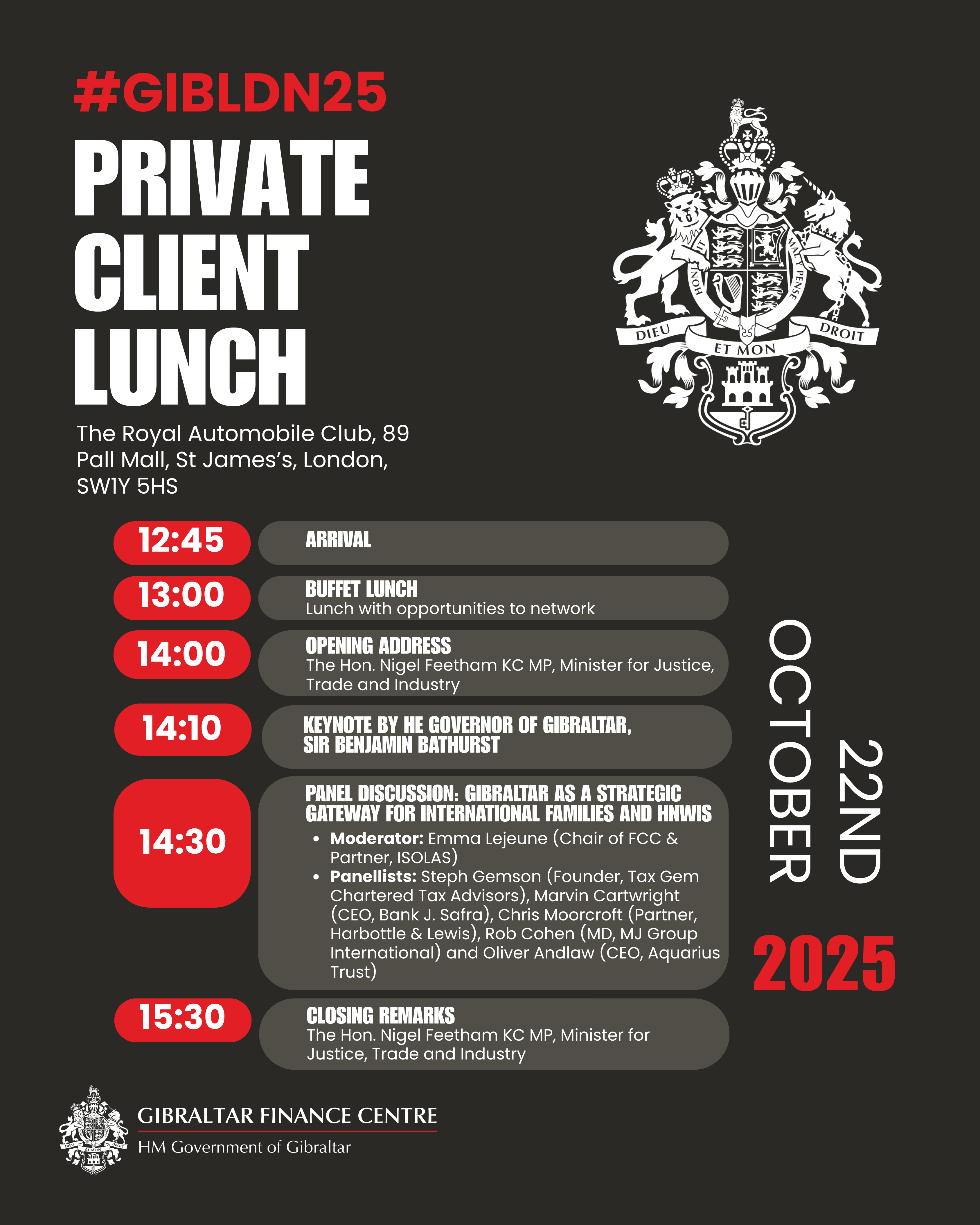 Nigel Feetham, Minister for Justice, Trade, and Industry, has issued notifications to the Gibraltar Finance Centre Council regarding a series of financial services events scheduled to take place in London this October.